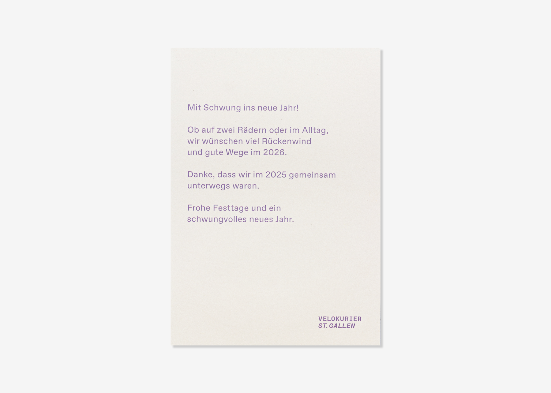 Eine Weihnachts- und Neujahrskarte für den Velokurier St. Gallen, bewusst abseits klassischer Motive. Entstanden ist eine Arbeit mit Stil und Beständigkeit, reduziert, handwerklich und mit einer klaren Haltung.