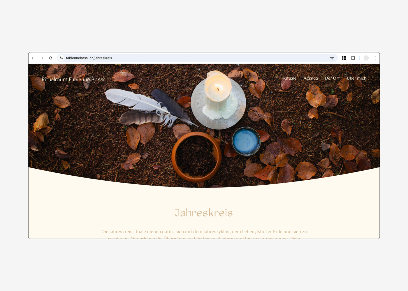 Fabienne Bossi startet 2025 ihre Selbstständigkeit als Fachfrau für Rituale. In enger Zusammenarbeit durfte ich für sie ein ganzheitliches visuelles Erscheinungsbild entwickeln. In einem ausführlichen Corporate-Identity-Workshop wurden Fabiennes Wesen und Vision in eine grafische Sprache übersetzt. Farben, Schriften, Formen, Mandalas, Symbole und Bilder fliessen harmonisch zu einem stimmigen Ganzen zusammen.